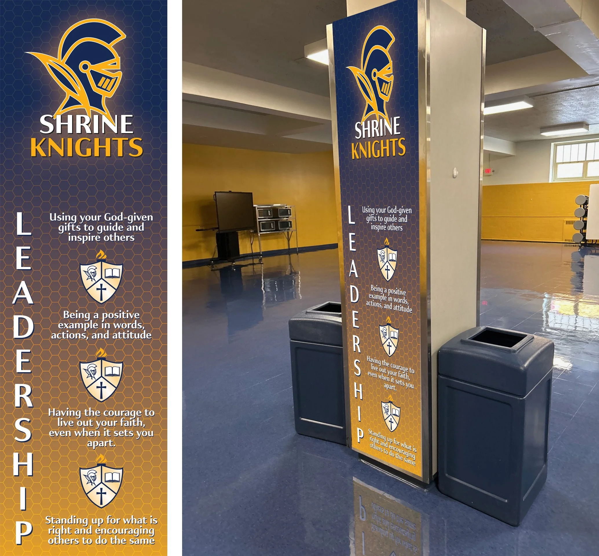 Part of a banner series designed in Adobe Illustrator. Recreated the Shrine Schools logo and produced a composite mockup in Photoshop to visualize installation, including a realistic reflection effect.